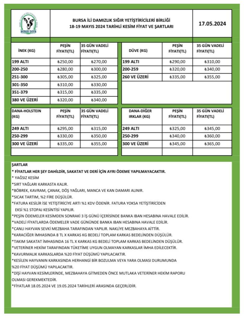 18-19 Mayıs 2024 Cumartesi ve Pazar günü üyelerimizin hayvanları Birliğimiz organizasyonuyla kestirilecektir. Kesim fiyatları ve şartları aşağıdaki tabloda sunulmaktadır. Kesim yaptırmak isteyen üyelerimizin şubelerimize başvurup, kayıt yaptırması gerekmektedir. Bilgilerinize, Saygılarımızla.