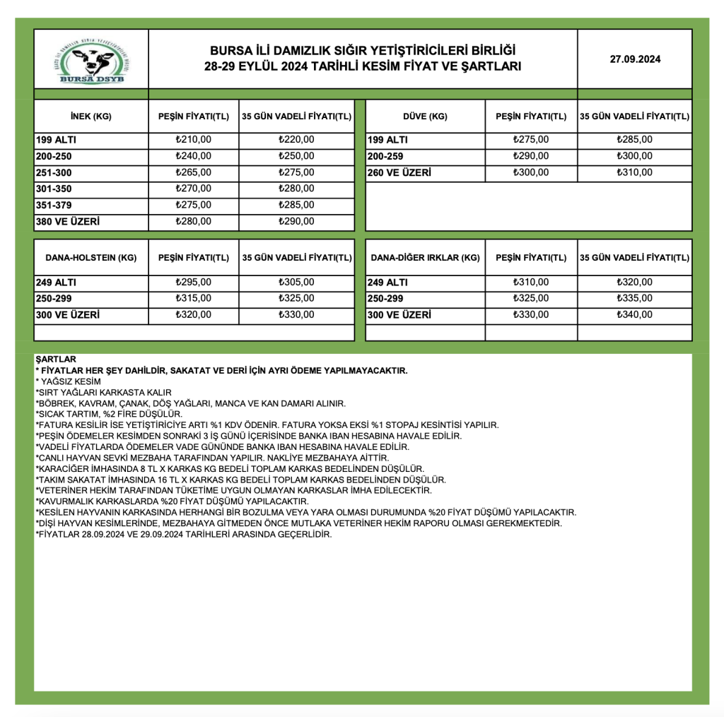 28-29 EYLÜL 2024 KESİM FİYATLARI