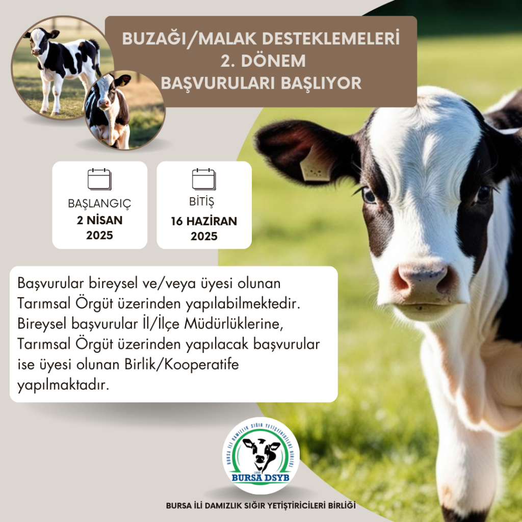 Buzağı/malak desteklemeleri 2. Dönem başvuruları 2 Nisan 2025 tarihinde başlayıp 16 Haziran 2025 tarihinde son bulacaktır. Başvurular bireysel ve/veya üyesi olunan Tarımsal Örgüt üzerinden yapılabilmektedir. Bireysel başvurular İl/İlçe Müdürlüklerine, Tarımsal Örgüt üzerinden yapılacak başvurular ise üyesi olunan Birlik/Kooperatife yapılmaktadır.