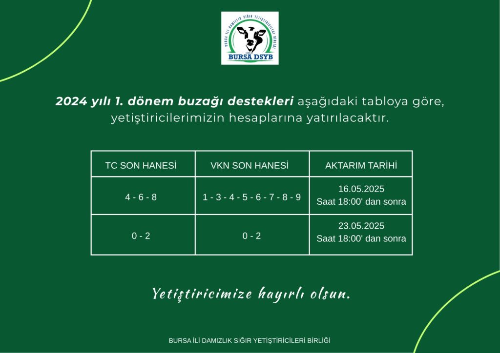 Buzağı destekleme tarihleri aşağıdaki tabloda sunulmaktadır. Bilgilerinize, saygılarımızla.