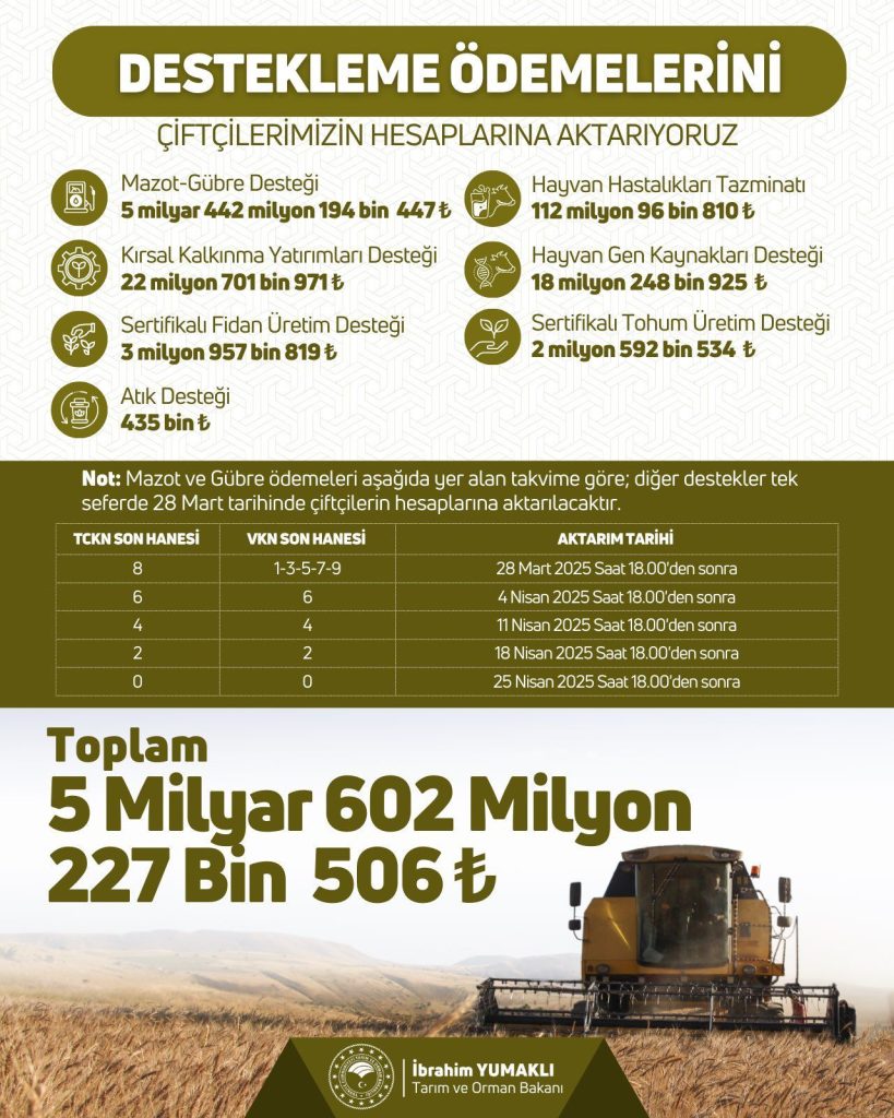 T.C. Tarım ve Orman Bakanlığı mazot/ gübre desteği ve diğer desteklemelerin ödeme tarihlerini açıklamıştır. Aşağıdaki tablodan kimlik veya vergi numaranızın son hanesine göre ödeme tarihini öğrenebilirsiniz. Bilgilerinize, saygılarımızla.