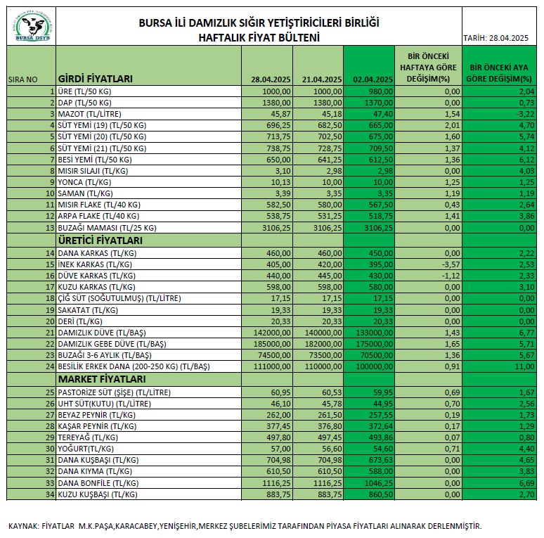 Bursa DSYB Haftalık Fiyat Bülteni
