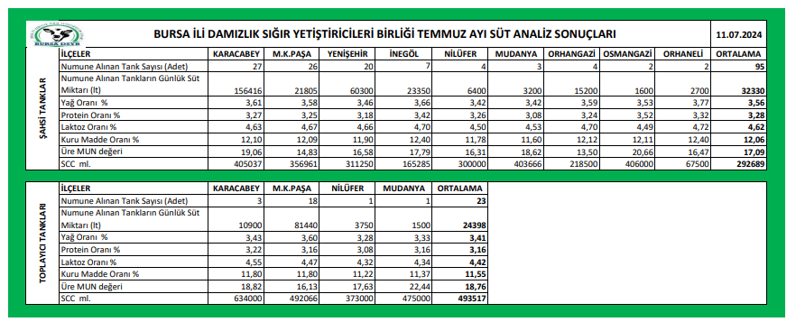 TEMMUZ AYI ÇİĞ SÜT ANALİZ SONUÇLARI
